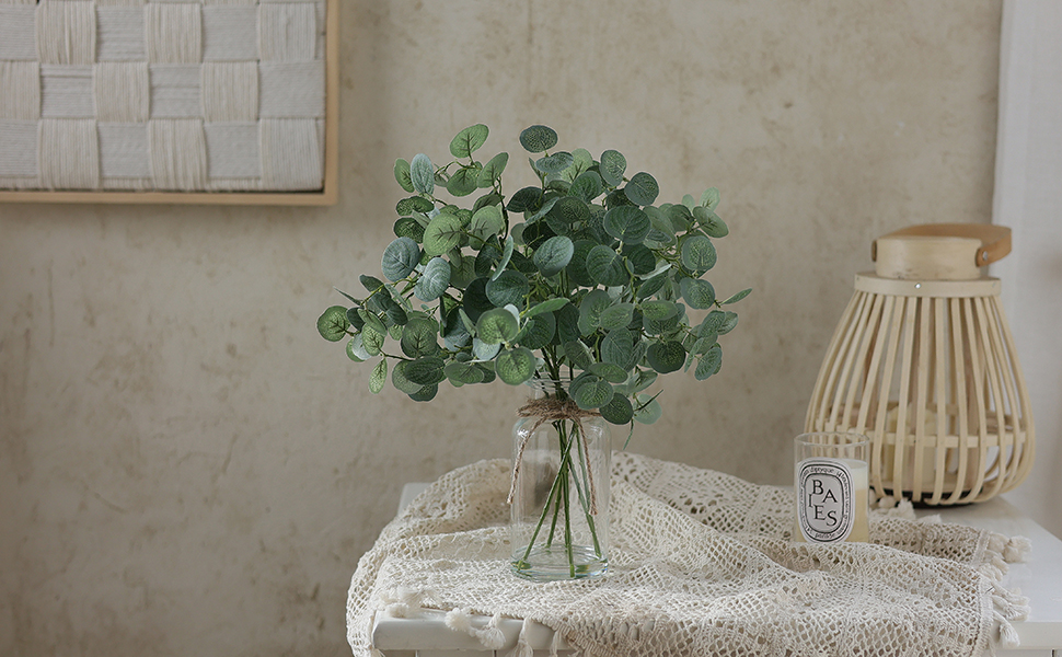 The faux eucalyptus stems are realistic, pliable, and color-balanced to mimic fresh leaves. The vase features thick glass with a weighted base, preventing tipping.