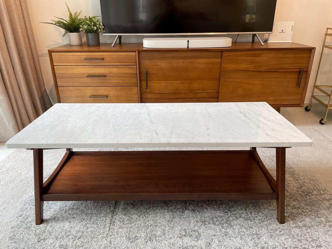 The Reeve Mid-Century Coffee Table by West Elm adds elegance and structure to an open living room. Its iconic walnut base and marble or wood top blend beautifully with minimalist and mid-century interiors. The piece helps anchor a seating area without being visually heavy.