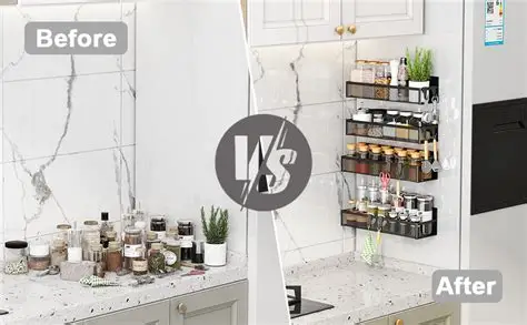 Use vertical space first. Install wall racks, magnetic storage, stackable containers, and cabinet-door organizers. Choose products that maximize height and reduce counter clutter.
