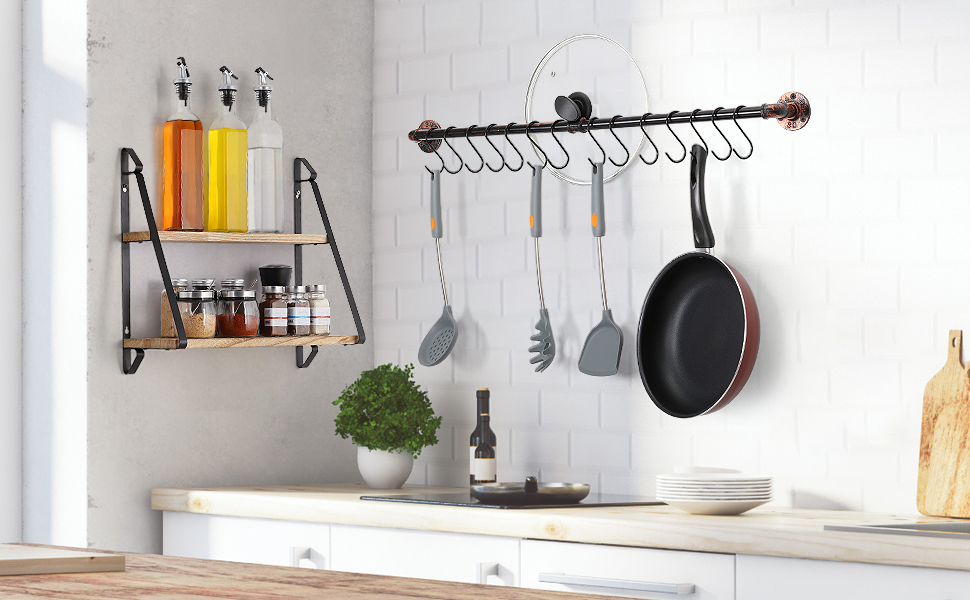 This pot rack mounts onto any wall, enabling the storage of pots, pans, and large utensils using hooks and an overhead shelf.