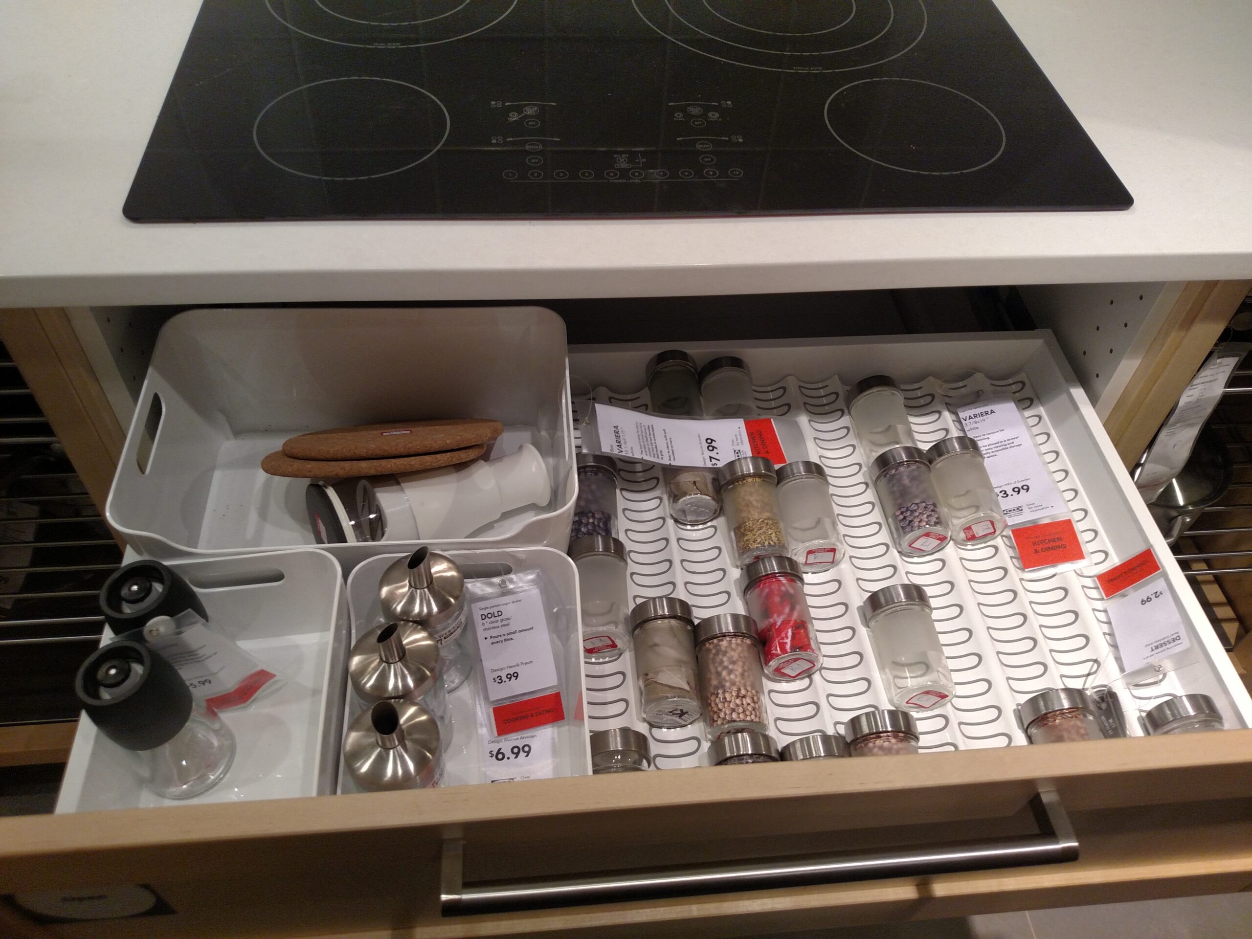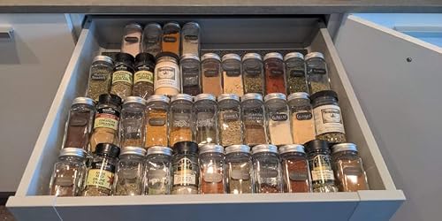 This product specifically addresses visibility, access, and the aesthetic of the spice storage area, turning a chaotic drawer into a functional, labeled station.