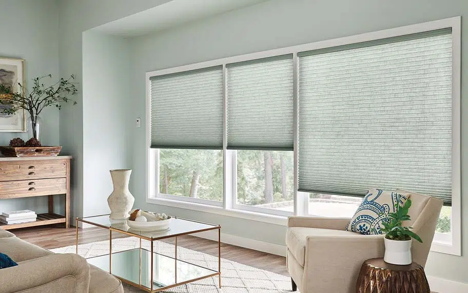 Sun Zero Cordless Cellular Shades provide thermal insulation and light diffusion for a soft morning glow.