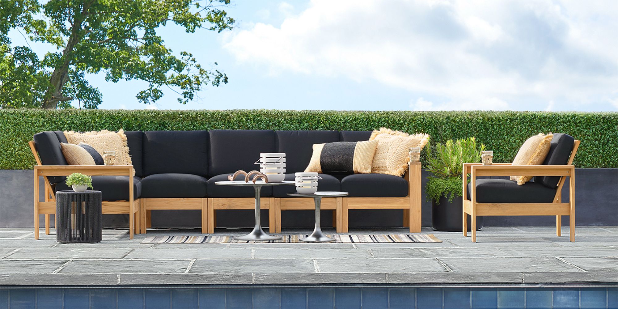 West Elm’s outdoor teak sectional focuses on modern aesthetics and sustainable sourcing. The teak wood is responsibly harvested, and the design emphasizes clean geometry and functional comfort.